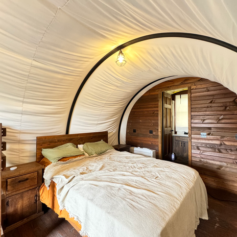 You can find each of our cozy locations on the acreage, walking distance from the main property, providing clients with privacy during their stay. Overlooking the lake, our colonial covered wagons are an authentic take on glamping. Our mobile home faces the horses' pasture and the porch provides a beautiful place to relax and unwind. Our luxury RV is parked underneath the trees by our serene gazebo.